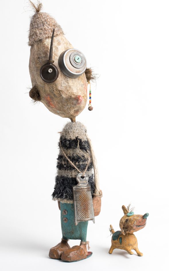 Pappmaché; Wolle; Muskatreibchen; Ölkännchen; Kaffeemaschinensieb; Knöpfe...