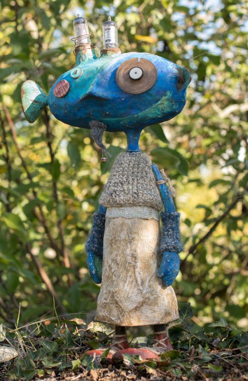 Pappmaché; Wolle; Radioröhren; Knöpfe; Messingscheibe...