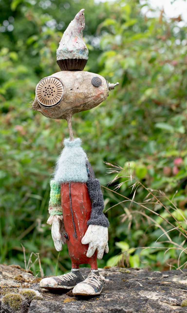Pappmaché; Wolle; Innenteil eines antiken Telefonhöres; altes Backförmchen; Knopf...