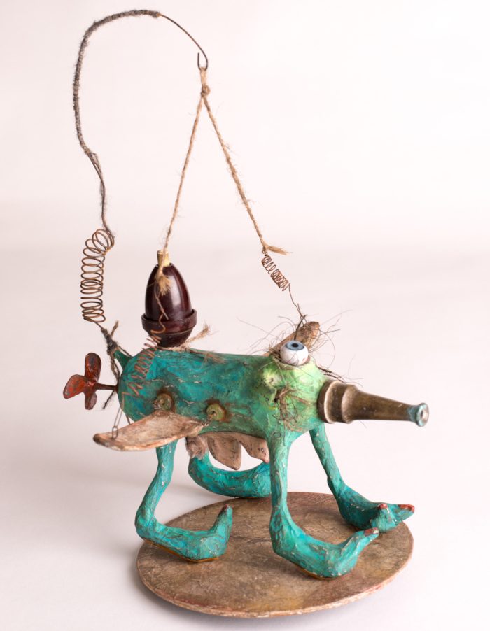 Pappmaché; antker Lichtschalter; Puppenauge aus mundgeblasenem Glas; Messingtülle; Eisenplatte...