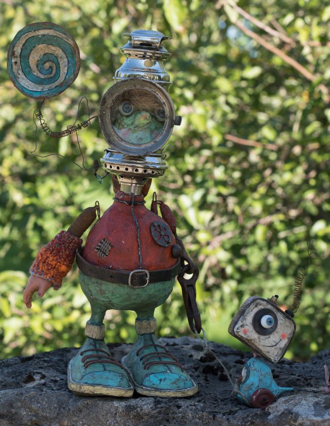 Pappmaché; Wolle; antike Fahrradlampe; antike Puppenaugen aus mundgeblasenem Glas; alter Puppenarm; Karabinerhaken...