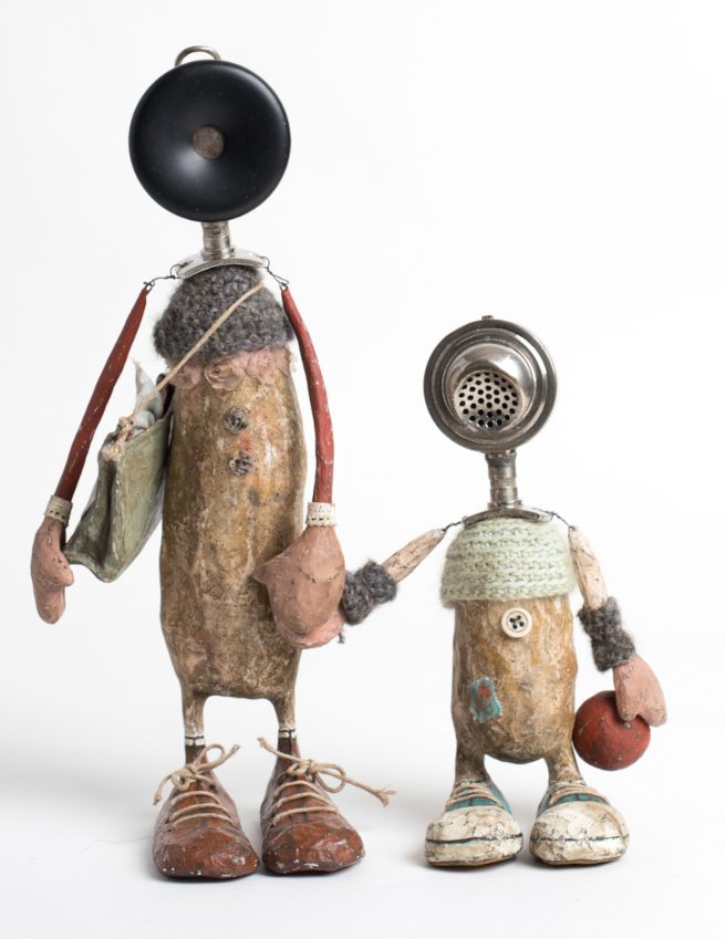 Pappmache, Wolle, Hörer und Sprechmuschel eines alten Telefons; Knöpfe...