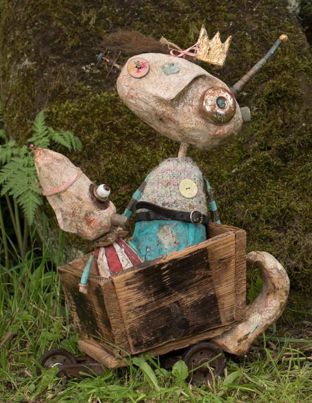 Pappmaché; Wolle; Teil einer gefundenen Fahrradklingel; antikes Puppenauge aus mundgeblasenem Glas; Fingerhut; aniker, dreirädriger Rollschuh, altes Holzkistchen...