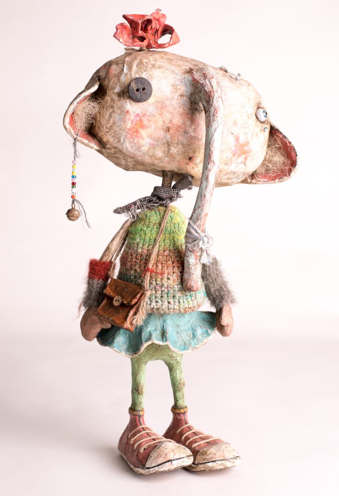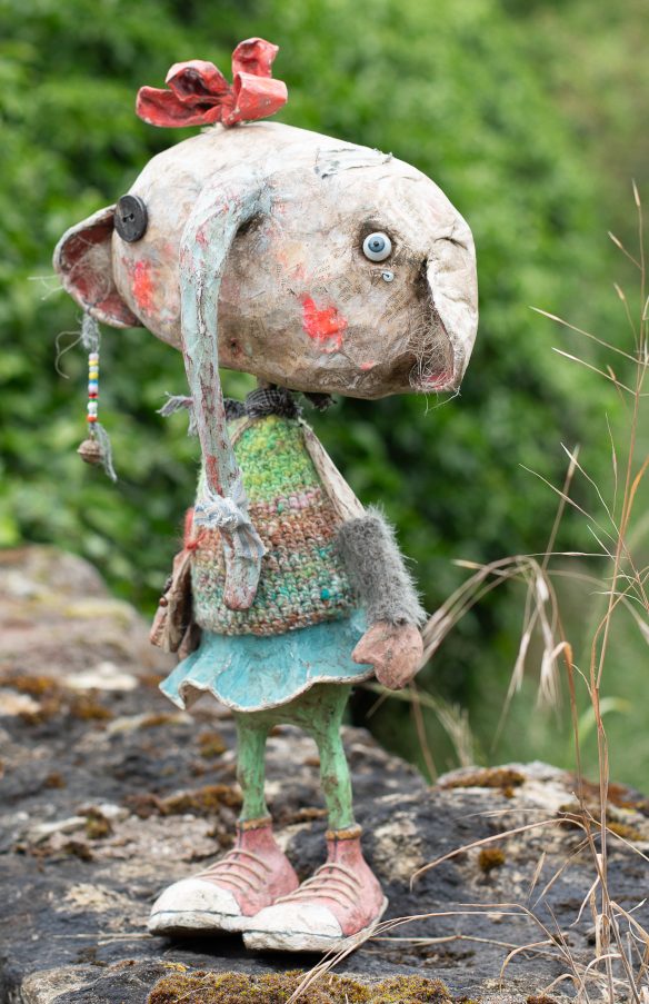 Pappmaché; Wolle; antikes Puppenauge aus mundgeblasenem Glas; Knopf...